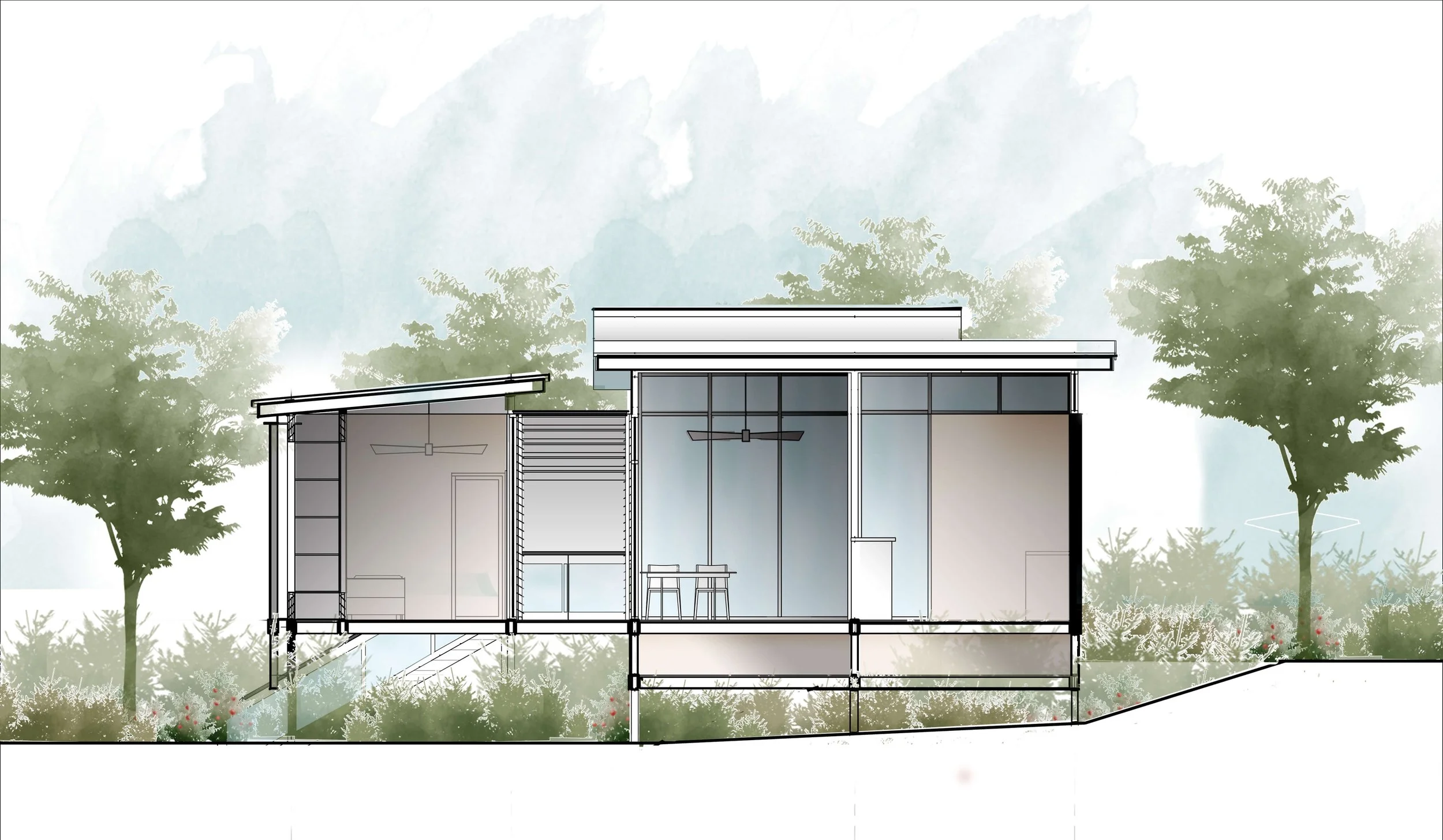 The clients did not proceed with the project as they wanted to retain most of the trees. However, it was developed as one of our modular base designs and variations are available for other sites.